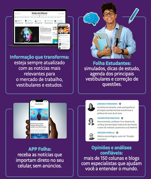 Com a credibilidade da Folha, vocĂȘ terĂĄ acesso Ă s melhores informaçÔes sobre o Brasil e o mundo, alĂ©m de conteĂșdos exclusivos que vĂŁo te ajudar a se destacar no mercado de trabalho, nos estudos e nos vestibulares.